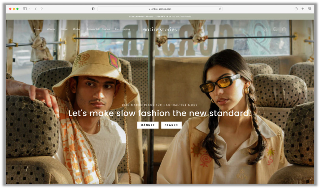 entire stories ist ein Marktplatz für nachhaltige Mode. Mit dem Ziel, nachhaltige Mode für jeden verständlich, zugänglich und attraktiv zu machen, sind Jacqueline, Elena und Cedric im November 2020 angetreten. Gestartet mit 20 Marken konnte entire stories auf heute über 60 Brands mit mehr als 3300 Produkten auf dem eigenen Marktplatz wachsen. Aus den Büroräumen in der Hamburger Innenstadt werden alle Themen Rund um Marketing, IT und Finanzierung betreut.